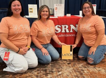 Safe Ride News thanks Nita Smith, Shawn Rohe, and Aubrey Klick for showing their Peachy enthusiasm with custom-made peach t-shirts at the Kidz in Motion conference.